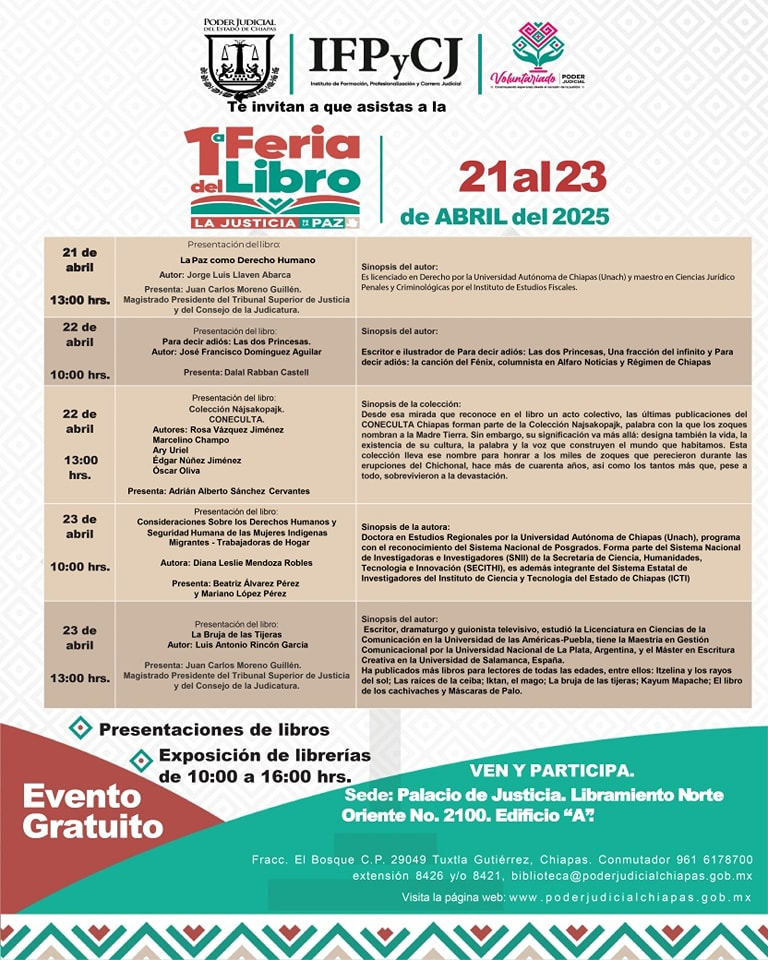 El Poder Judicial del Estado de Chiapas anunció la realización de la 1ª Feria del Libro “La Justicia es la Paz”, un evento cultural y académico que se llevará a cabo del 21 al 23 de abril, en el edificio “A” del Palacio de Justicia de Tuxtla Gutiérrez, en un horario de 10:00 a 16:00 horas. La entrada será libre para todo el público.