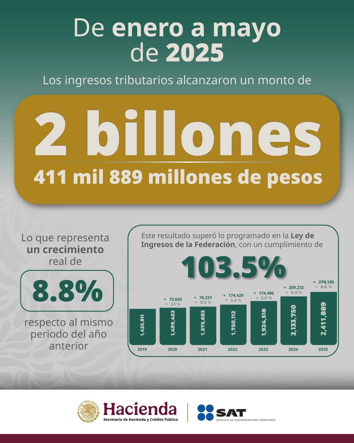 El Servicio de Administración Tributaria (SAT) informó que, de enero a mayo de 2025, se recaudaron 278 mil 139 millones de pesos más en comparación con el mismo periodo del año anterior, lo que representa un crecimiento real del 8.8% en los ingresos del erario.