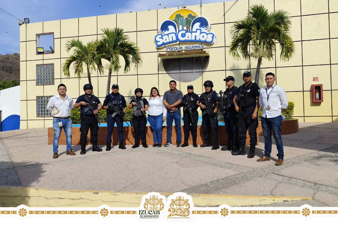Con el propósito de garantizar la seguridad de los visitantes durante el actual periodo vacacional, el H. Ayuntamiento que encabeza el C. Eliseo Morales Rosales, a través de la Secretaría de Seguridad, implementó acciones de prevención del delito en el Parque Acuático San Carlos.
