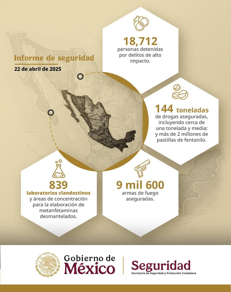 La dependencia federal destacó que estos logros se enmarcan dentro de la Estrategia Nacional de Seguridad, impulsada por el Gabinete de Seguridad que encabeza la Presidenta Claudia Sheinbaum Pardo, y que ha sido clave para lograr una reducción significativa en delitos de alto impacto, incluyendo el homicidio doloso, el tráfico de drogas y la portación ilegal de armas.