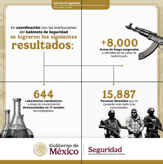 Entre las acciones realizadas por el Gabinete de Seguridad, del 1 de octubre de 2024 al 23 de marzo de 2025, se destacan los siguientes resultados: