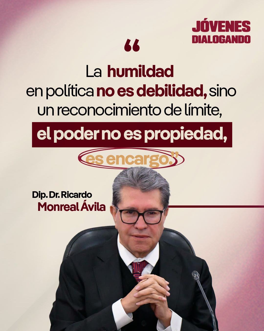 Desde la bancada de Morena en la Cámara de Diputadas y Diputados, el legislador Ricardo Monreal Ávila expresó que el poder no debe entenderse como propiedad personal, sino como un encargo que emana directamente del pueblo, por lo que debe ejercerse con plena responsabilidad y sentido democrático.