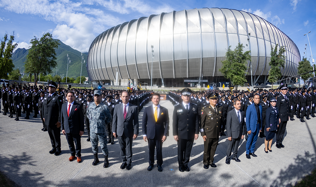 Como parte de los esfuerzos del Gobierno de Nuevo León para garantizar la seguridad de la población, el gobernador Samuel Alejandro García Sepúlveda encabezó la ceremonia de graduación de 363 cadetes del curso “Formación Inicial para Policía Fuerza Civil”. El evento se realizó en el Estadio de los Rayados en Guadalupe, con la presencia de autoridades estatales y federales.
