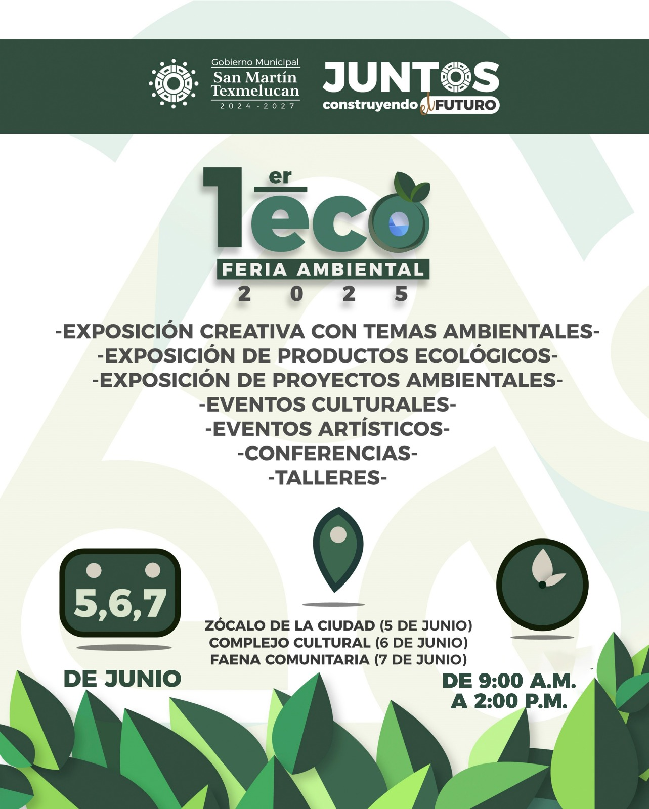El Gobierno Municipal de San Martín Texmelucan, a través de la Secretaría de Obras Públicas, Desarrollo Urbano y Medio Ambiente, en coordinación con la Jefatura de Medio Ambiente, anunció la realización de la Primera Eco Feria Ambiental 2025. Esta iniciativa tiene como objetivo principal fomentar la conciencia ecológica entre la ciudadanía mediante actividades culturales, educativas y comunitarias.