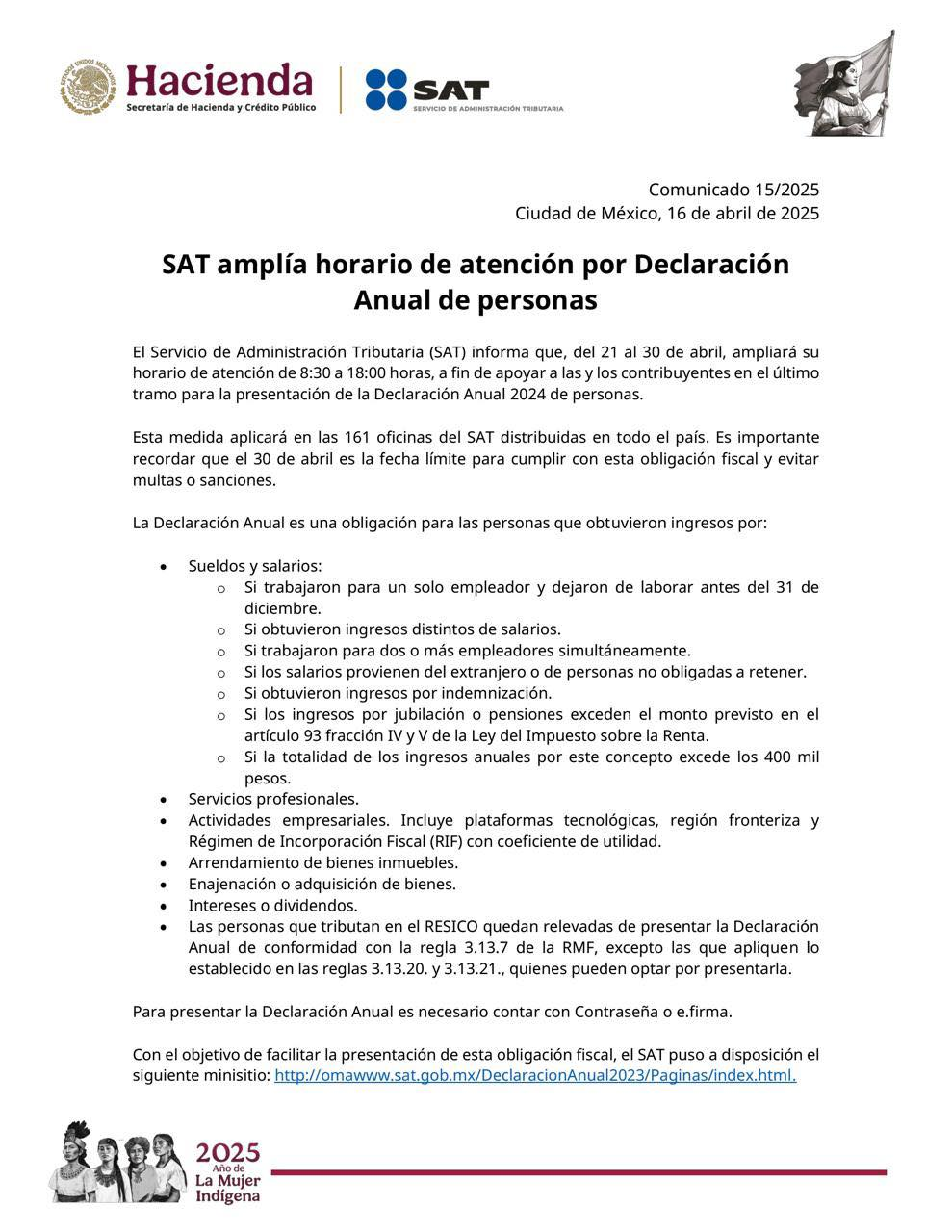 La dependencia recordó que el 30 de abril es la fecha límite para cumplir con esta obligación fiscal. No obstante, para mayor comodidad, las y los contribuyentes pueden presentar su declaración en línea las 24 horas, los 7 días de la semana, a través del Portal del SAT.