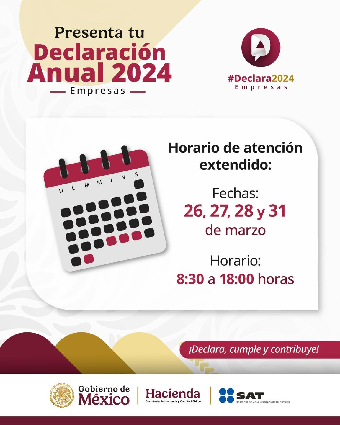El Servicio de Administración Tributaria (SAT) anunció la ampliación de los horarios de atención en sus oficinas para apoyar a las empresas en la presentación de la Declaración Anual 2024. Esta medida busca agilizar el proceso y brindar asistencia oportuna a los contribuyentes que deben cumplir con sus obligaciones fiscales.