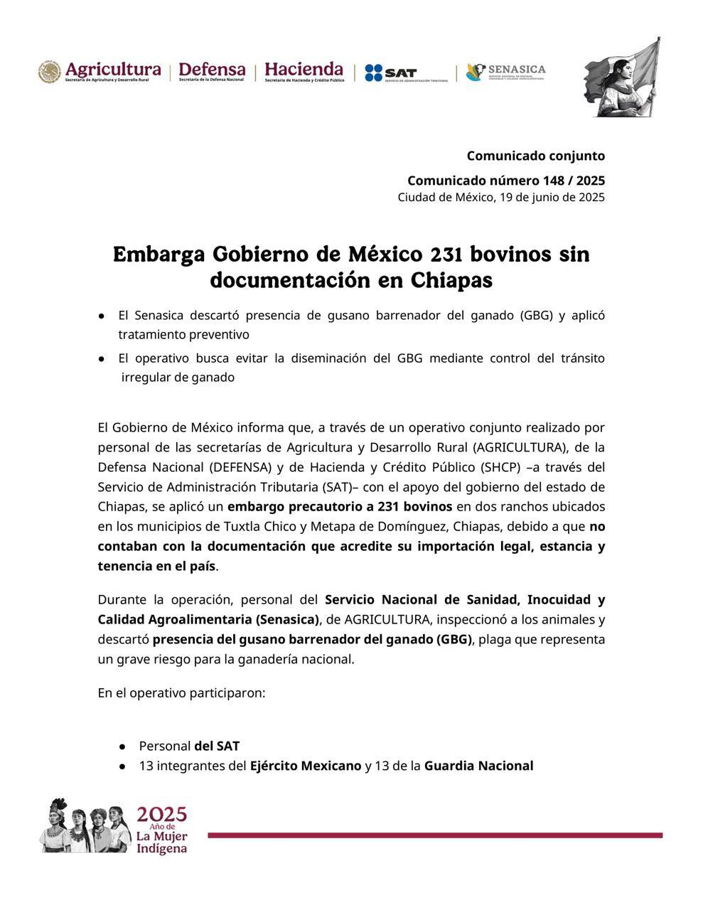 Con estas acciones, el Gobierno de México reafirma su compromiso con la legalidad, el fortalecimiento del Estado de derecho y el combate frontal a las irregularidades en los procesos de importación de mercancías, incluyendo ganado.