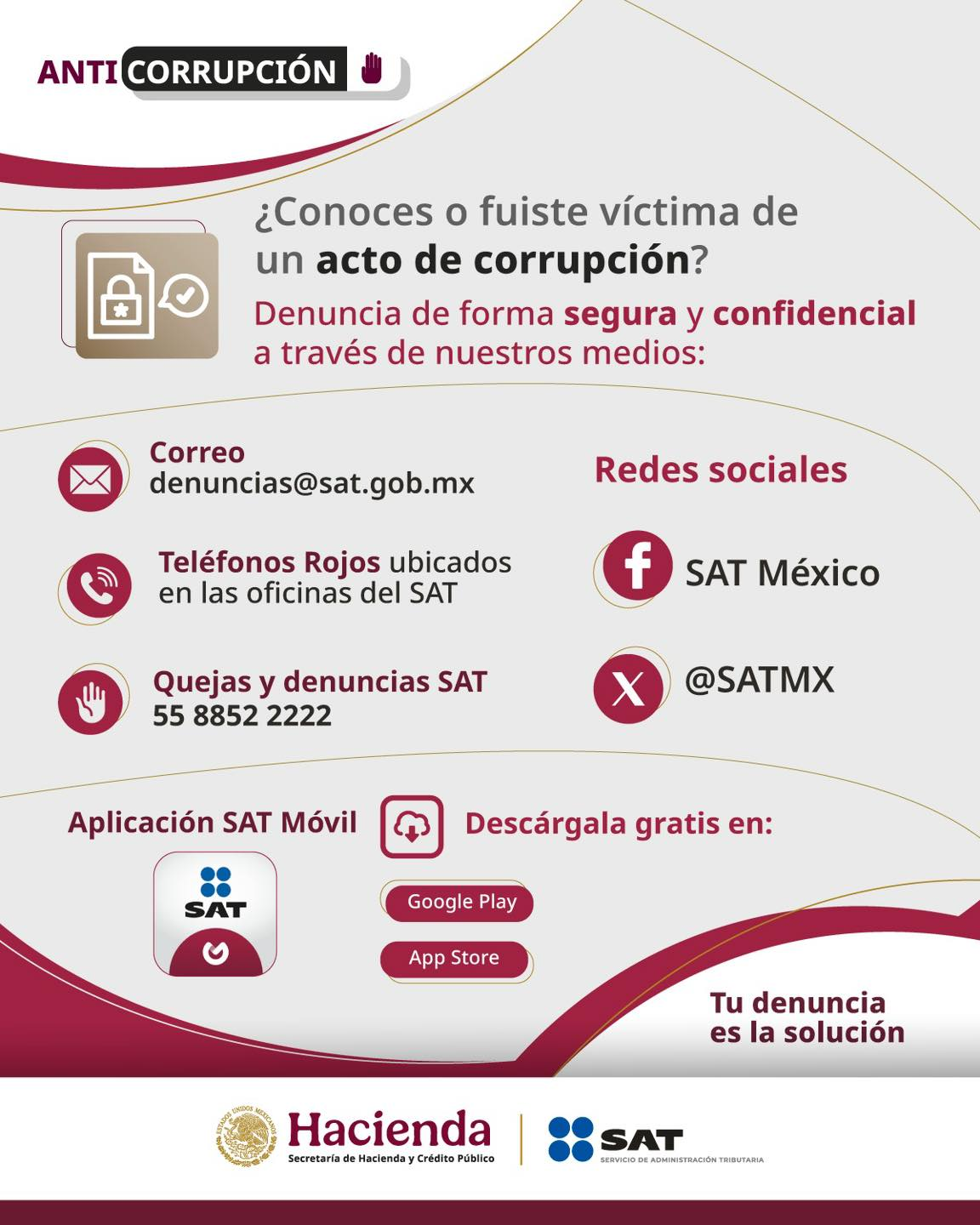 El Servicio de Administración Tributaria (SAT) reiteró su compromiso con la legalidad y la transparencia al invitar a la ciudadanía a denunciar cualquier acto de corrupción del que haya sido testigo o víctima. La institución puso a disposición diversos canales oficiales para presentar denuncias de manera segura, anónima y confidencial.