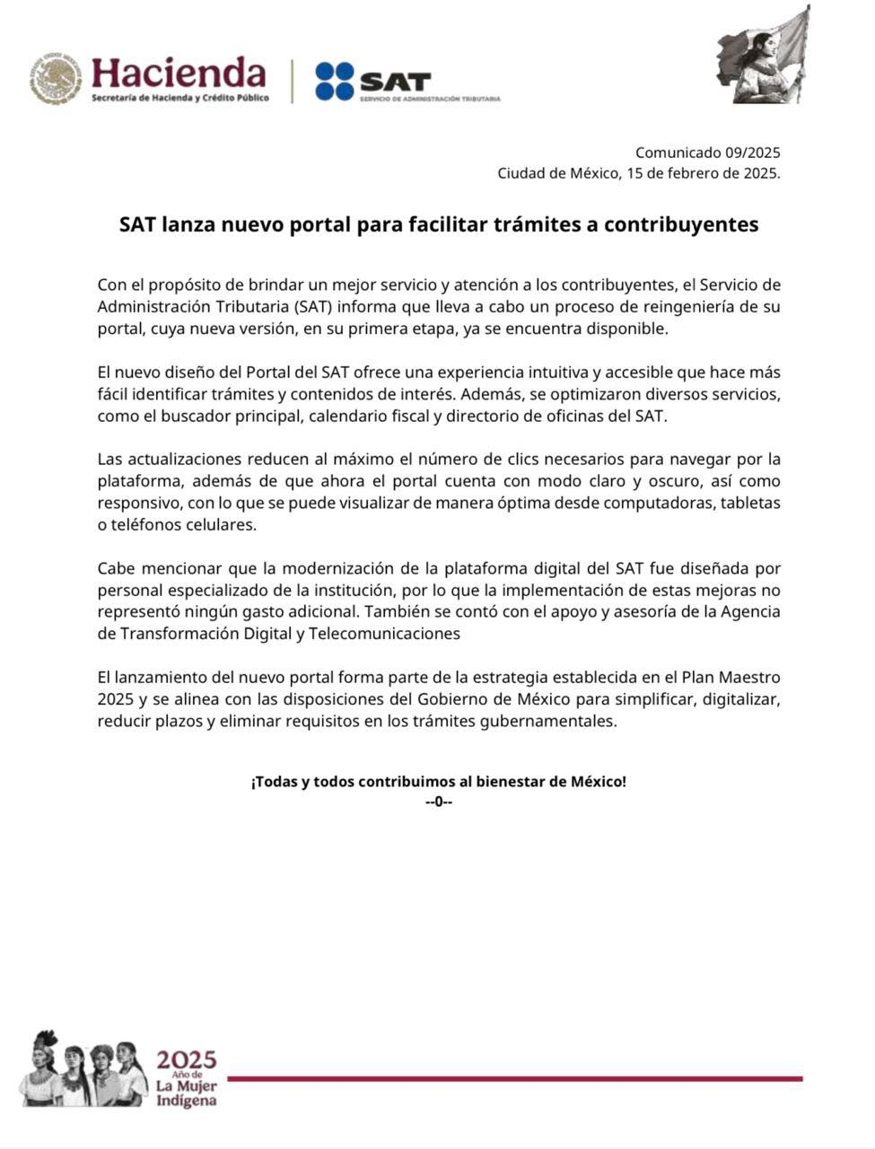 ervicio de Administración Tributaria | 15 de febrero de 2025 | Con el propósito de brindar un mejor servicio y atención a los contribuyentes, el Servicio de Administración Tributaria (SAT) informa que lleva a cabo un proceso de reingeniería de su portal, cuya nueva versión, en su primera etapa, ya se encuentra disponible.