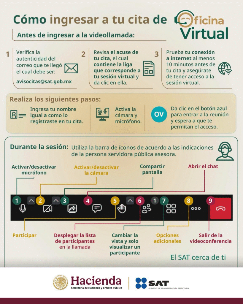 El Servicio de Administración Tributaria (SAT) informó que a partir del 1 de julio estará disponible una nueva plataforma de videollamadas en su Oficina Virtual, con el propósito de facilitar y agilizar el acceso a trámites y servicios de manera remota. Esta actualización tecnológica permitirá a las y los contribuyentes ingresar a sus citas en línea directamente desde el enlace recibido por correo electrónico, sin necesidad de descargar aplicaciones adicionales en sus dispositivos.