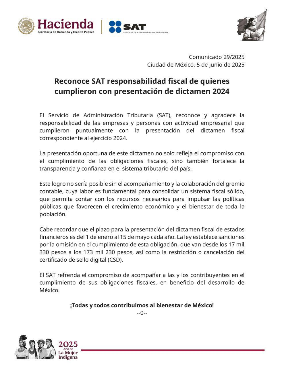 El Servicio de Administración Tributaria (SAT) expresó su reconocimiento a las y los contribuyentes que presentaron en tiempo y forma el dictamen fiscal correspondiente al ejercicio 2024, lo cual refleja un compromiso firme con el cumplimiento de las obligaciones fiscales y contribuye al fortalecimiento del sistema tributario nacional.