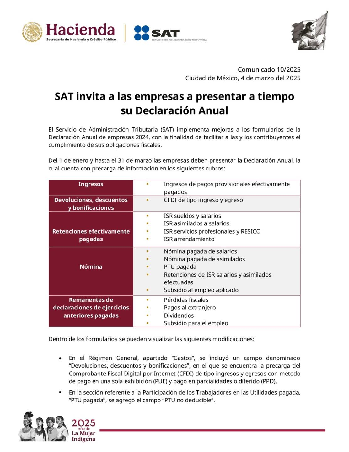 El Servicio de Administración Tributaria (SAT) hizo un llamado a las empresas para que presenten su Declaración Anual del ejercicio 2024 antes del 31 de marzo, fecha límite establecida para el cumplimiento de esta obligación fiscal.