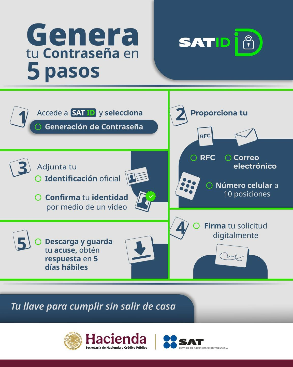 A través de una guía práctica de cinco pasos, el SAT explica que para generar la Contraseña es necesario ingresar al portal satid.sat.gob.mx, seleccionar la opción “Generación de Contraseña” y proporcionar datos personales como el RFC, correo electrónico y número celular de 10 dígitos.