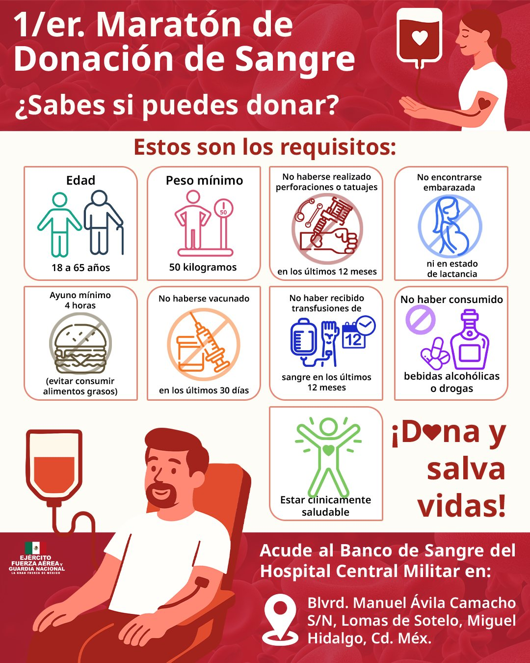 La SEDENA informó que las y los interesados en participar deberán cumplir con los requisitos médicos establecidos para ser donantes, los cuales pueden consultarse en el sitio oficial del evento o directamente en el Hospital Central Militar. La ubicación del Banco de Sangre puede consultarse a través del siguiente enlace: https://maps.app.goo.gl/ogwuS2wYmjuQpx92A.