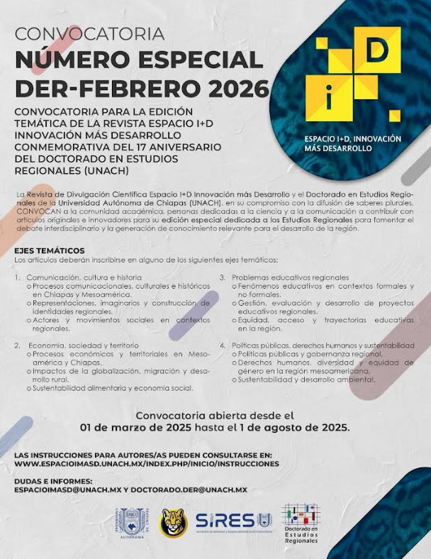 Tuxtla Gutiérrez, Chiapas. – La Universidad Autónoma de Chiapas (UNACH), a través de la Secretaría de Identidad y Responsabilidad Social Universitaria y el Doctorado en Estudios Regionales, convoca a investigadores y académicos a participar en una edición especial de su revista digital de divulgación científica, Espacio i+D.