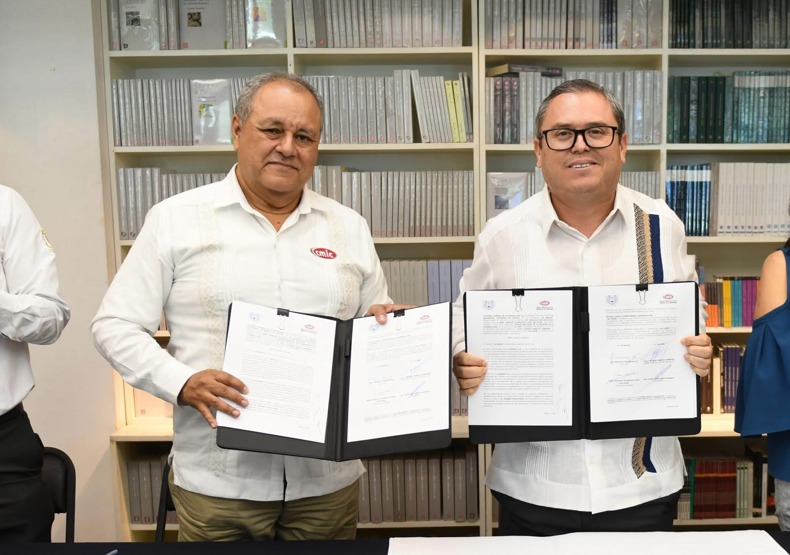 Ante integrantes de esta Cámara y de la comunidad universitaria, el rector Oswaldo Chacón Rojas y el presidente del Comité Directivo de la CMIC, Rogelio Tamayo Carboney, signaron este acuerdo en las instalaciones de la Librería del Fondo de Cultura Económica “José Emilio Pacheco”.
